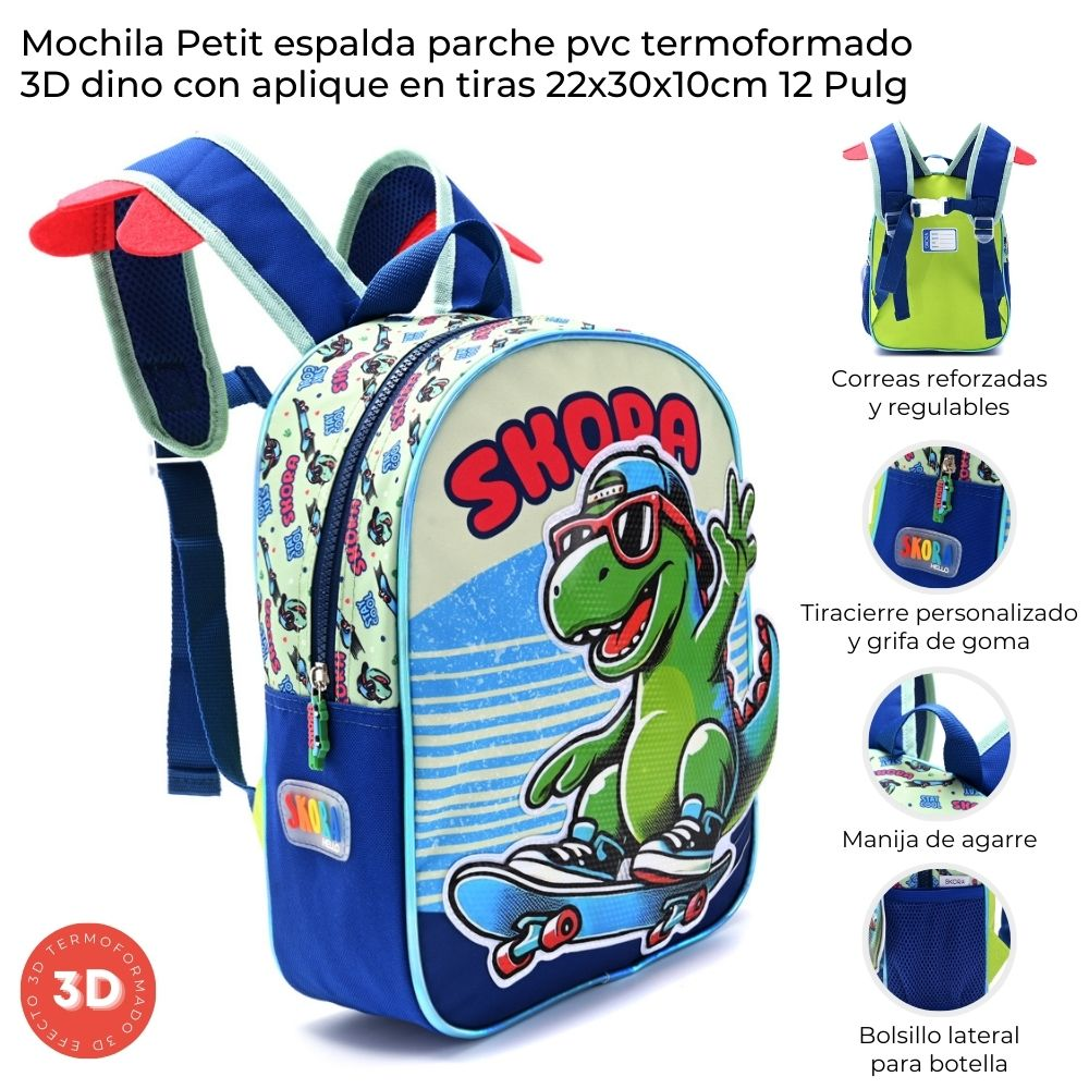 Mochila Skora Petit Espalda Termoformada 3D Dino 22X30X10Cm 12"